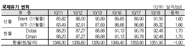 한국석유공사에 따르면, 런던원유거래소(ICE)의 브렌트유(Brent) 선물유가는 배럴당 91.50달러로 전일대비 1.60달러 급등했고, 뉴욕상업거래소(NYMEX)의 WTI(서부텍사스 경질유) 역시 1.66달러 급등한 88.32달러에 거래를 마감했다.