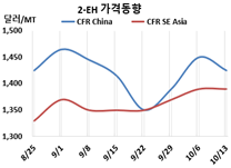 2-EH(Ethylhexanol) 시세는 10월13일 CFR China가 톤당 1425달러로 25달러 하락했으나 CFR SE Asia는 1390달러로 변동이 없었다.