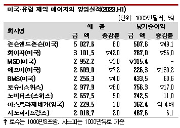 글로벌 제약 메이저 상당수가 수익 악화로 고전하고 있다. 표, 그래프: <미국·유럽 제약 메이저의 영업실적(2023.H1)> <화학저널 2023년 10월 23·30일> |