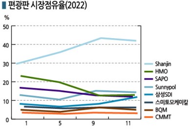 중국 LCD 생산기업들이 서플라이체인 관리를 의식하고 코로나19 방역 강화와 함께 자국산 편광판 채용을 늘리면서 주요 메이저 Shanjin은 시장점유율이 2022년 1월 28.7%에서 9월 42.8%로 급등했고 HMO 역시 11.5%에서 14.4%로, SAPO는 7.2%에서 7.8%로 상승했다.