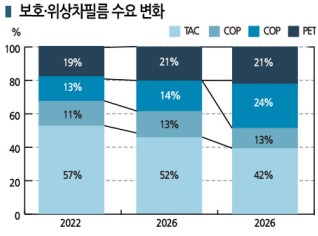 비TAC 필름 1위이며 PET필름 21%, COP필름 13%가 뒤따를 것으로 파악된다.