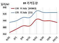 아시아 PP 시세는 10월18일 CFR FE Asia 기준 라피아(Raffia) 및 인젝션(Injection) 그레이드가 톤당 895달러, IPP Film 및 BOPP는 910달러, 블록 코폴리머(Block Copolymer)는 925달러로 변동이 없었다. CFR SE Asia는 라피아 및 인젝션 950달러, IPP Film 및 BOPP 960달러, 블록 코폴리머 975달러로 각각 20달러 하락했다. CFR S Asia도 라피아·인젝션 990달러, BOPP 및 IPP Film 1010달러, 블록 코폴리머 1035달러로 각각 20달러 떨어졌다.