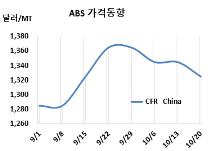 ABS(Acrylonitrile Butadiene Styrene)는 다시 하락했다. ABS 시세는 10월18일 CFR China가 톤당 1325달러, CFR SE Asia는 1345달러로 각각 20달러 하락했다. CFR S Asia도 1355달러로 변동이 없었다. 표, 그래프: <ABS 가격동향> <화학저널 2023/10/25> |