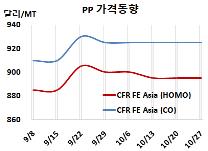원료 프로필렌(Propylene)은 10월24일 CFR China 톤당 850달러로 변동이 없었고, PP(라피아: CFR FE Asia)와 프로필렌(CFR China)의 스프레드는 여전히 톤당 45달러로 손익분기점 150달러를 크게 밑돌아 적자가 확대되고 있는 것으로 분석된다.