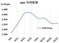ABS(Acrylonitrile Butadiene Styrene)는 변동이 없었다. ABS 시세는 10월25일 CFR China가 톤당 1325달러, CFR SE Asia는 1345달러로 변동이 없었다. CFR S Asia도 1355달러로 보합세를 형성했다. 표, 그래프: <ABS 가격동향> <화학저널 2023/11/01> |