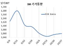 SM(Styrene Monomer)은 대체로 보합세를 형성했다. SM 시세는 10월27일 FOB Korea가 톤당 1060달러로 5달러 올랐으나, CFR SE Asia는 1075달러로 변동이 없었다. CFR China는 1045달러로 보합세를 형성했고, CFR India는 1115달러로 10달러 올랐다. 표, 그래프: <SM 가격동향> <화학저널 2023/11/01> |