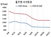 톨루엔(Toluene)은 하락했다. 톨루엔 시세는 10월27일 FOB Korea가 톤당 870달러, CFR SE Asia는 930달러로 각각 5달러 하락했다. CFR China는 860달러로 20달러 떨어졌고, CFR India는 990달러로 10달러 하락했다. 표, 그래프: <톨루엔 가격동향> <화학저널 2023/11/01> |