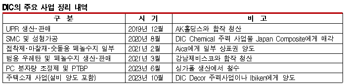 DIC가 포트폴리오 전환을 가속화하고 있다. DIC는 2022년 초부터 기능성 상품 사업을 중심으로 매출액 200억엔 상당의 사업 철수를 추진하고 있으며 2023년 10월에는 정리 대상 중 매출액 80억엔으로 가장 큰 비중을 차지하고 있는 DIC Decor의 주택소재 사업 매각을 단행할 계획이다. 표, 그래프: <DIC의 주요 사업 정리 내역> <화학저널 2023/11/03> |