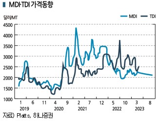 글로벌 가격이 하락함으로써 수입제품 유입이 확대됐고 우레탄 폼 뿐만 아니라 페인트, 접착제, 씰링 소재, 엘라스토머 등 비발포 수요도 감소한 것으로 파악된다.