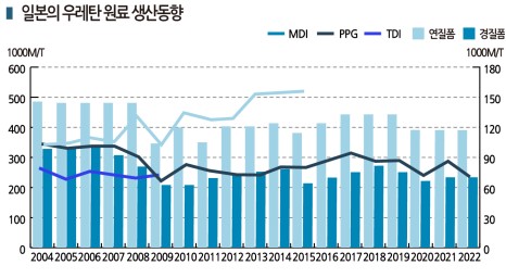 일본은 주요 우레탄 원료 공급국 중 하나이나 최근 중국에 밀려 영향력이 축소되고 있다.