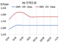 PS(Polystyrene)는 변동이 없었다. GPPS(General Purpose PS) 시세는 11월1일 CFR China가 1220달러, CFR SE Asia는 1235달러, CFR India는 1295달러로 변동이 없었다.