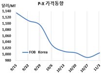 P-X(Para-Xylene)는 반등했다. P-X 시세는 11월3일 FOB Korea가 톤당 1005달러로 15달러 상승했고, CFR SE Asia는 1030달러로 25달러 올랐다. CFR Taiwan도 1035달러로 15달러 상승했다. 표, 그래프: <P-X 가격동향> <화학저널 2023/11/09> |