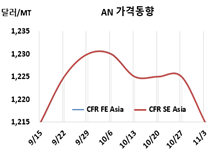 AN(Acrylonitrile)은 하락했다. AN 시세는 11월3일 CFR NE Asia가 톤당 1215달러, CFR SE Asia도 1215달러로 각각 10달러 하락했다. CFR S Asia도 1240달러로 10달러 떨어졌다. 표, 그래프: <AN 가격동향> <화학저널 2023/11/09> |