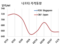 나프타(Naphtha)는 하락했다. 나프타 시세는 11월3일 C&F Japan 톤당 656달러로 3달러 하락했다. 표, 그래프: <나프타 가격동향> <화학저널 2023/11/10> |