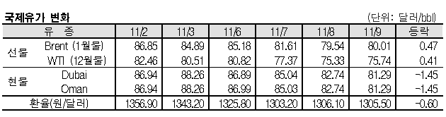 브렌트유가 11월7일-8일에 걸쳐 지정학적 리스크 약화와 경제활동 둔화 예상 등으로 6.6% 떨어지면서 9월 고점이었던 96.55달러에서 약 20달러 대폭 하락함에 따라 저가 매수세가 유입된 것으로 분석된다.