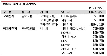 전고체전지용 양극재는 중국에서 주류를 이루고 있는 LFP(인산철리튬) 뿐만 아니라 하이니켈 소재 채용이 가능해 에너지밀도가 800-1000Wh 수준에 달할 것으로 예상하고 있다.