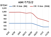 HDPE(High-Density Polyethylene)는 하락했다. HDPE 시세는 11월8일 인젝션(Injection) 그레이드 기준 CFR FE Asia가 톤당 915달러, CFR SE Asia는 950달러로 변동이 없었다. 블로우몰딩(Blow-Molding)은 FEA가 920달러로 10달러 하락했지만, SEA는 965달러로 변동이 없었다. 필름(Film)도 FEA가 945달러로 10달러 떨어졌지만, SEA는 985달러로 변동이 없었고, 얀(Yarn) 역시 FEA가 940달러로 10달러, SEA는 975달러로 보합세를 형성했다. CFR S Asia는 인젝션 965달러로 20달러, 블로우몰딩 975달러로 20달러, 필름 975달러로 20달러, 얀 965달러로 25달러 하락했다. 표, 그래프: <HDPE 가격동향> <화학저널 2023/11/13> |