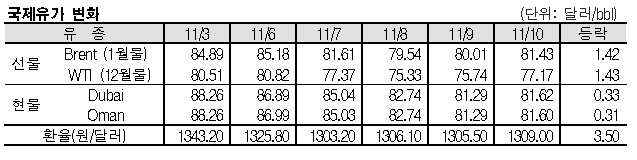11월10일 국제유가는 저가 매수세 유입 지속을 타고 상승했다. 국제유가는 저가 매수세 유입으로 상승했다. 표, 그래프: <국제유가 변화> <화학저널 2023/11/13> |