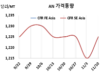 AN 시세는 11월10일 CFR NE Asia가 톤당 1225달러, CFR SE Asia도 1225달러로 각각 10달러 상승했다. CFR S Asia는 1240달러로 변동이 없었다. 유럽 현물가격은 FD NWE 톤당 1170달러로 20달러 하락했다.