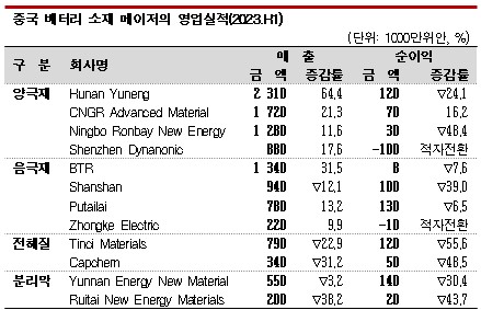 LFP(인산철리튬)계 메이저인 다이나노익(Shenzhen Dynanonic)은 매출이 88억위안으로 17.6% 증가했으나 순이익은 마이너스 10억위안으로 적자 전환했다. 양극재 원료용 리튬염 가격이 하락했고 다운스트림 수요 둔화로 판매가격이 급락했기 때문이다. 생산 코스트 증가도 적자 요인으로 작용했다.