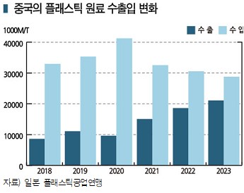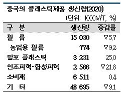중국은 2020년 플래스틱 원료 생산량이 1억355만톤으로 8.2% 증가하며 최초로 1억톤을 돌파했다. 당시 수입량은 5244만9000톤으로 1.6%,