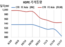 HDPE 시세는 11월16일 인젝션(Injection) 그레이드 기준 CFR FE Asia가 톤당 885달러로 30달러, CFR SE Asia는 930달러로 20달러 하락했다. 블로우몰딩(Blow-Molding)은 FEA가 910달러로 10달러, SEA는 935달러로 30달러 떨어졌다. 필름(Film)도 FEA가 945달러로 변동이 없었지만, SEA는 965달러로 20달러 하락했고, 얀(Yarn)은 FEA가 920달러로 20달러, SEA는 955달러로 20달러 떨어졌다. CFR S Asia는 인젝션 965달러, 블로우몰딩 975달러, 필름 975달러, 얀 965달러로 변동이 없었다.