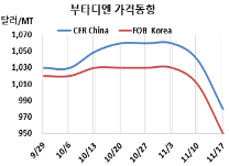 부타디엔(Butadiene)은 폭락했다. 부타디엔 시세는 11월17일 FOB Korea가 톤당 950달러로 60달러, CFR SE Asia는 905달러로 65달러 폭락했다. 중화권은 CFR China가 980달러로 60달러, CFR Taiwan은 985달러로 45달러 하락했다. FOB Korea는 9월8일 톤당 950달러를 형성한 이후 10주만에 1000달러가 무너지며 폭락했다.