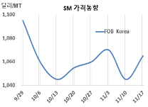 SM(Styrene Monomer)은 상승했다. SM 시세는 11월17일 FOB Korea가 톤당 1065달러로 20달러, CFR SE Asia는 1090달러로 30달러 상승했다. CFR China도 1055달러, CFR India도 1120달러로 각각 25달러 올랐다.
