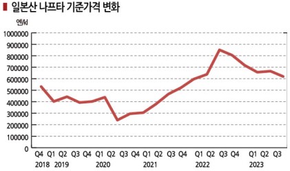 일본산 나프타 기준가격은 2023년 3분기 킬로리터당 6만3000엔으로 전분기대비 3900엔 하락했고 3분기 연속 6만엔대에 머물렀다.