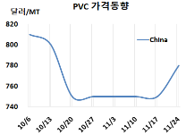 PVC(Polyvinyl Chloride)는 6주만에 상승했다. PVC 시세는 11월22일 CFR China가 톤당 780달러, CFR SE Asia는 785달러로 각각 30달러 상승하며 6주만에 보합세에서 벗어났다. CFR India도 805달러로 20달러 올랐다. 유럽도 11월24일 FD NWE 톤당 900유로로 30유로 하락하며 8주만에 하락했다. 표, 그래프: <PVC 가격동향> <화학저널 2023/11/28> |