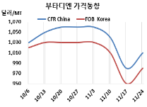 부타디엔(Butadiene)은 상승했다. 부타디엔 시세는 11월24일 FOB Korea가 톤당 980달러로 30달러, CFR SE Asia는 925달러로 20달러 상승했다. 중화권은 CFR China가 1010달러로 30달러, CFR Taiwan은 1005달러로 20달러 ddhffkT다.