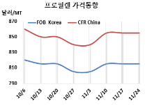 프로필렌 시세는 11월24일 FOB Korea가 톤당 815달러, CFR SE Asia는 805달러로 변동이 없었다. 중화권도 CFR China가 855달러, CFR Taiwan은 855달러로 보합세에 그쳤다.