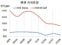 벤젠 시세는 11월24일 FOB Korea가 톤당 875달러로 20달러, CFR SE Asia는 845달러로 25달러 하락했고, CFR India는 885달러로 15달러 떨어졌다. CFR China는 900달러로 15달러, CFR Taiwan은 895달러로 20달러 하락했다.