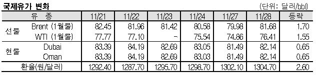 11월28일 국제유가는 카자흐스탄의 원유 생산 감소로 급등했다. 국제유가는 카자흐스탄 원유 생산 감소의 영향으로 급등했다. 표, 그래프: <국제유가 변화> <화학저널 2023/11/29> |