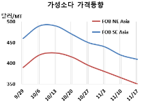 가성소다(Caustic Soda)는 하락세가 이어졌다. 가성소다 시세는 11월24일 FOB NE Asia가 톤당 340달러로 10달러 하락했고 CFR SE Asia는 410달러로 변동이 없었다.