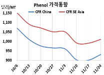페놀(Phenol)은 상승했다. 페놀 시세는 11월24일 CFR China가 톤당 930달러로 30달러, CFR SE Asia는 1010달러로 20달러 상승했다.