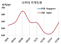 나프타(Naphtha)는 폭등했다. 나프타 시세는 11월24일 C&F Japan 톤당 658달러로 31달러 폭등했다.