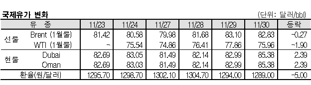 브렌트유, 82.83달러로 0.27달러 떨어져 … 두바이유는 85.38달러