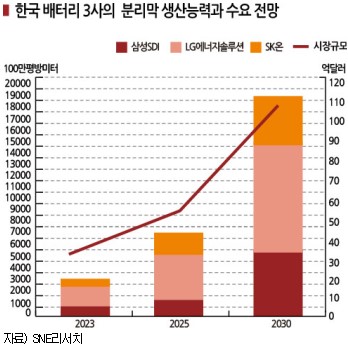 SNE리서치에 따르면, LG에너지솔루션, SK온, 삼성SDI 등 국내 배터리 3사는 분리막 수요가 2023년부터 연평균 17% 증가해 2030년 100억달러(약 13조900억원)를 넘어서고 SK온, 삼성SDI에게 각각 LiB 분리막을 공급하는 SK아이이테크놀로지(SKIET)와 더블유씨피(WCP)가 글로벌 분리막 시장을 주도할 것으로 전망되고 있다. SKIET는 SK이노베이션의 자회사이다.