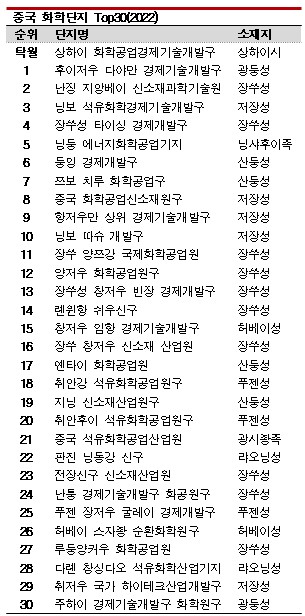 중국이 화학단지 관리를 강화하고 있다. 표, 그래프: <중국 화학단지 Top30(2022), 중국 화학단지 현황(2022)> <화학저널 2023년 12월 4일> |