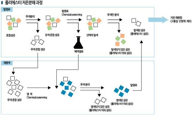 연구진은 분류된 폴리에스터 섬유를 저온분해해 합성 이전의 단량체 원료로 되돌리는 CR 기술까지 개발했다. 단량체는 화학 결합으로 고분자가 될 수 있는 단분자물질이며 플래스틱 원료로 사용할 수 있다.
