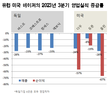 메이저 다수가 2023년 3분기 영업실적이 감소했으며 적지 않은 화학기업이 수요 둔화 및 중국경제 회복 둔화, 인플레이션, 유럽 특유의 구조적 문제로 코스트 감축과 공장 폐쇄, 가동 중단에 내몰린 것으로 알려졌다.
