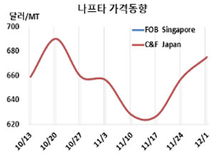 나프타(Naphtha)는 상승했다. 나프타 시세는 12월1일 C&F Japan 톤당 675달러로 17달러 상승했다. 표, 그래프: <나프타 가격동향> <화학저널 2023/12/08> |