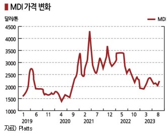 유안타증권에 따르면, 글로벌 MDI 가격은 5월 기준 톤당 2513달러로 최근 10개년 평균가격 2525달러를 하회했고 2023년 1분기에는 건축·가전용 단열재 수요 둔화 영향을 받아 2330달러로 급락했다.
