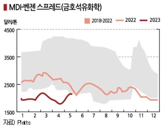 국내 1위 MDI 생산기업인 금호미쓰이화학의 모기업 금호석유화학은 2023년 2분기 영업이익이 1079억원으로 전년동기대비 70% 격감했다. 강동진 현대차증권 연구원은 “화학산업 전반에서 수요 부진 및 공급과잉이 지속됨에 따라 하반기에도 수익성을 대폭 개선하기 어려울 것”이라고 강조했다.