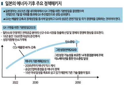 일본 정부가 2023년 공개한 GX 기본방침은 온실가스 배출량 감축(탈탄소), 에너지 공급 안정, 경제 성장 등 3개 요소를 동시에 실현하기 위한 전략으로 주목받고 있다.