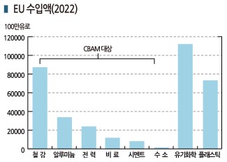 EU는 2022년 수입액 중 CBAM 적용이 예상되는 유기화학제품과 플래스틱이 각각 1100억유로, 710억유로로 CBAM 대상 품목 중 가장 큰 철강 관련 740억유로에 필적하는 수준인 것으로 파악하고 있다.
