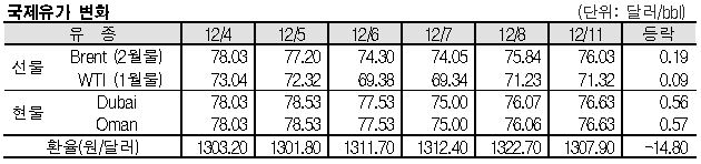 12월11일 국제유가는 미국의 전략비축유 구매계획 발표로 상승했다. 국제유가는 미국의 전략비축유 구매계획 발표로 상승했다. 표, 그래프: <국제유가 변화> <화학저널 2023/12/12> |