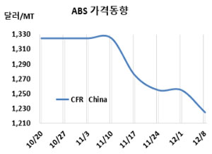 ABS(Acrylonitrile Butadiene Styrene)는 하락했다. ABS 시세는 12월6일 CFR China가 톤당 1225달러로 30달러, CFR SE Asia는 1255달러로 20달러 하락했다. CFR S Asia도 1285달러로 20달러 떨어졌다. CFR China는 7월5일 1224달러를 형성한 이후 꾸준히 상승하며 9월20일 1365달러까지 도달했으나 이후 차츰 하락하여 1200달러 붕괴위기에 처했다. 표, 그래프: <ABS 가격동향> <화학저널 2023/12/13> |