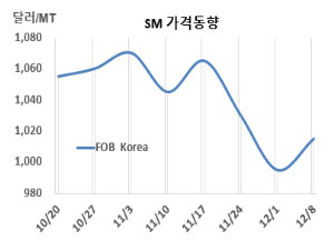 SM(Styrene Monomer)은 상승했다. SM 시세는 12월8일 FOB Korea가 톤당 1015달러로 20달러, CFR SE Asia는 1035달러로 15달러 상승했다. CFR China는 1005달러로 20달러 상승했으며, CFR India는 1065달러로 10달러 올랐다. 표, 그래프: <SM 가격동향> <화학저널 2023/12/13> |
